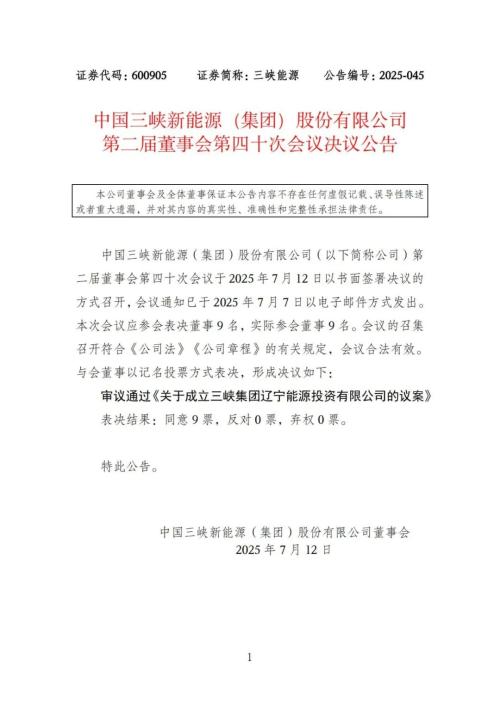 公告显示,中国三峡新能源(集团)股份有限公司(以下简称公司)第二届董事会第四十次会议于2025年7月12日以书面签署决议的方式召开。审议通过《关于成立三峡集团辽宁能源投资有限公司的议案》。