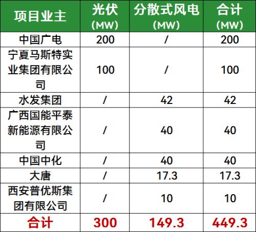 其中,光伏项目3个,规模共计300MW;分散式风电项目6个,规模共计149.3MW。