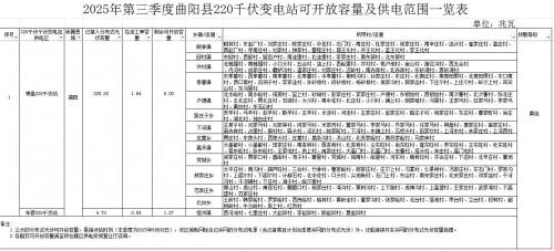 为保障曲阳县域电网运行安全可靠,切实提升分布式光伏消纳能力和并网服务水平,指导分布式光伏发电有序开发。现将2025年第三季度曲阳县220千伏变电站可开放容量及供电范围进行公示。