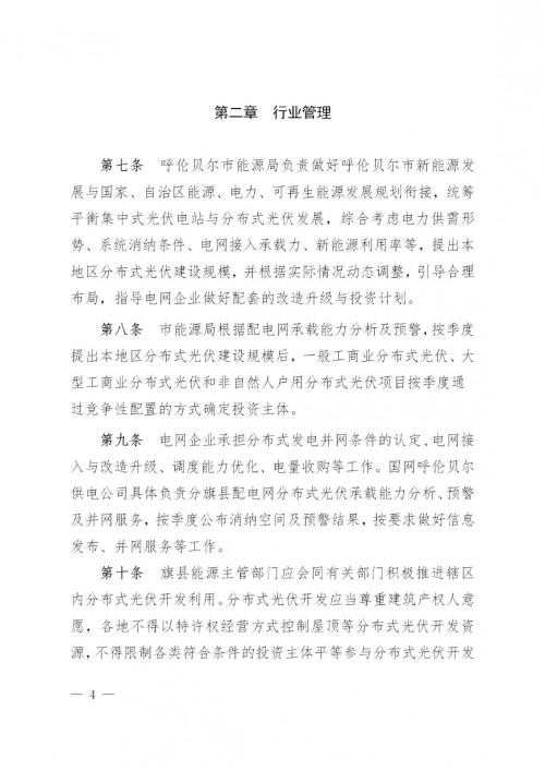 文件表示,本细则适用于呼伦贝尔市行政区域内分布式光伏项目行业管理、建设管理、电网接入、运行管理等。