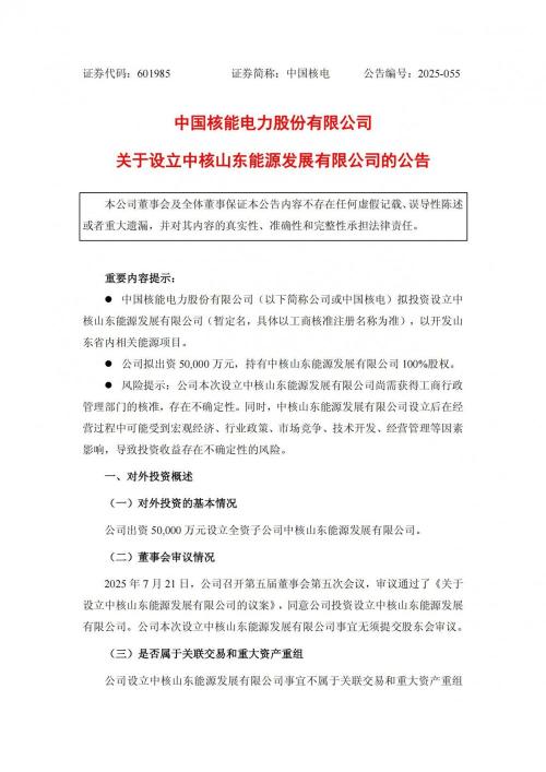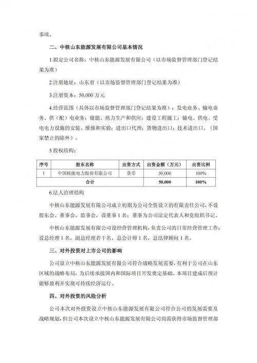 公告表示,中国核能电力股份有限公司(以下简称公司或中国核电)拟投资设立中核山东能源发展有限公司(暂定名,具体以工商核准注册名称为准),以开发山东省内相关能源项目。