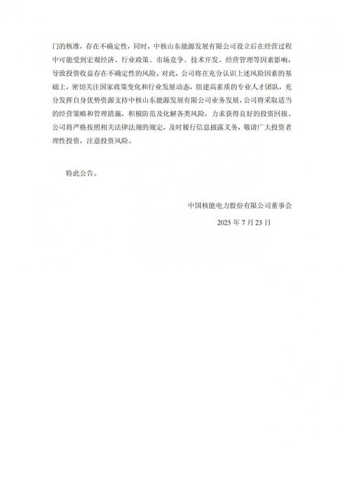 光伏头条获悉,7月22日晚间,中国核能电力股份有限公司发布关于设立中核山东能源发展有限公司的公告。