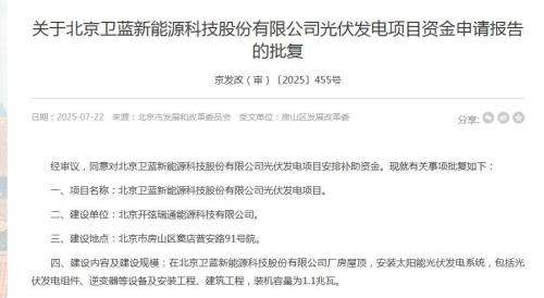 7月22日,北京市发展和改革委员会发布关于北京卫蓝新能源科技股份有限公司光伏发电项目资金申请报告的批复。