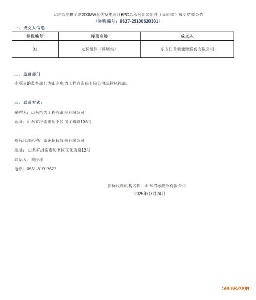 近日,大唐金能棋子湾200MW光伏发电项目EPC总承包的异质结(HJT)光伏组件采购标段中标结果尘埃落定,根据中国招标投标网7月24日更新的信息,东方日升新能源股份有限公司成功中标该项目。