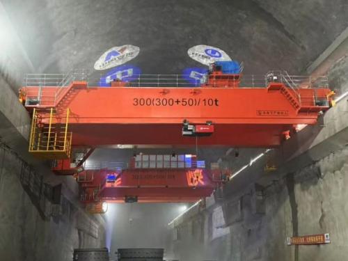 浙江松阳抽蓄电站地下厂房共布置两台桥式起重机,跨度23.5m,各配备300t主钩、50t副钩及10t电动葫芦各一套,吊装范围全面覆盖主厂房区域,地下厂房主桥机投运后将承担机组座环蜗壳、定子、转子等大型关键部件吊装任务,对地下厂房后续金结机电安装作业至关重要。