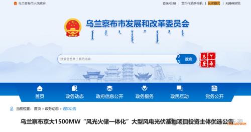 8月1日,内蒙古乌兰察布京大1500MW“风光火储一体化”大型风电光伏基地项目投资主体优选公告发布。