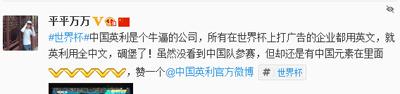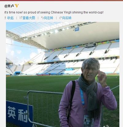 自世界杯开赛以来,赛场边广告牌上不时出现的“中国英利”和“光伏入户”几个汉字随即引发外界关注和讨论,前国家队主帅米卢在自己的官方微博里配发了一张英利的广告牌并表示,看到中国英利闪耀世界杯感到非常骄傲。很多国内球迷则发图表示看到中国汉字出现在世界杯赛场上感到自豪,并力挺英利赞助之举。