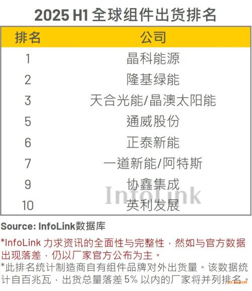 根据InfoLink的调研,2025上半年全球前十大组件供货商总出货量约为247.9 GW,环比去年同期增长10%。