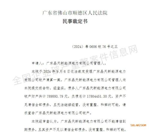 裁定书表明,2024年9月6日,顺德区人民法院裁定受理广东晶天新能源电力有限公司(简称“晶天电力”)破产清算案。晶天电力管理人报告称,经核实,该公司破产财产仅789893.79元,负债却高达17804451.30元,资产远不足以清偿债务,且无法继续经营,重整与和解均无可能,故请求宣告其破产。