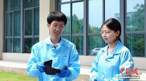 8月13日,团队成员展示柔性钙钛矿太阳能手机壳。尹柳清摄