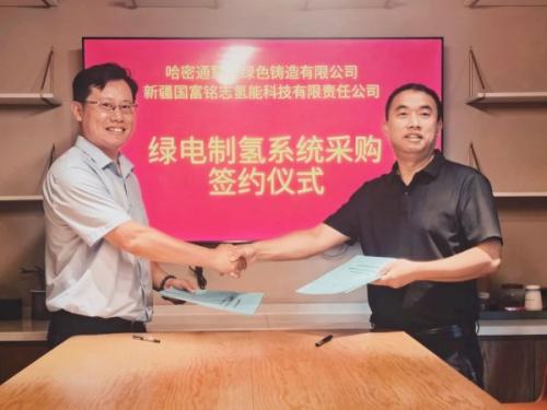 2025年8月18日,国富氢能全资控股公司新疆国富铭志氢能科技有限责任公司(以下简称“国富铭志”)与哈密通慧德绿色铸造有限公司(以下简称“哈密通慧德”)在哈密正式签订采购合同,双方就氢能核心装备采购达成深度合作,标志着国富氢能电解制氢技术在西北工业场景的规模化应用迈出关键一步。