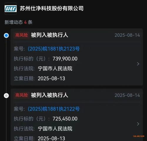 8月14日,苏州仕净科技股份有限公司新增两条“高风险被列入被执行人”动态。