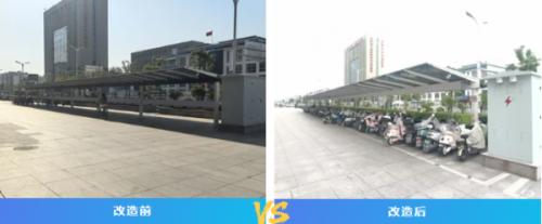 在项目规划设计中,淮阴分公司坚守“智慧基建与城市美学融合”理念:现代流线型棚体设计与商务广场智能化建筑群有机呼应,既构建起规范化的电动自行车停放充电空间,又成为园区智慧景观的重要组成部分。技术层面更实现“光储充”系统集成创新——顶部光伏板将太阳能转化为电能,通过储能系统形成“自发自用、余电存储”的绿色能源闭环,大幅降低传统能源依赖,为智慧城市能源管理提供了微观实践样本。