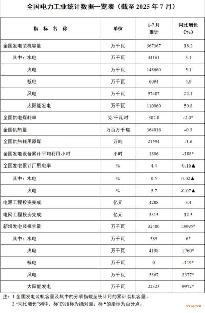 国家能源局发布2025年1-7月份全国电力工业统计数据