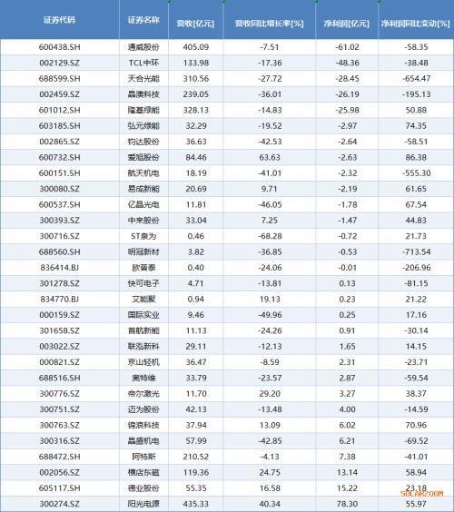 如,隆基绿能营收同比下降14.83%,净亏损25.69亿元,通威营收同比下降7.51%,亏损49.55亿元,晶澳营收同比下降36.01%,亏损25.8亿元,TCL中环营收同比下降17.36%,净亏损42.42亿元,协鑫预亏2.5亿元。