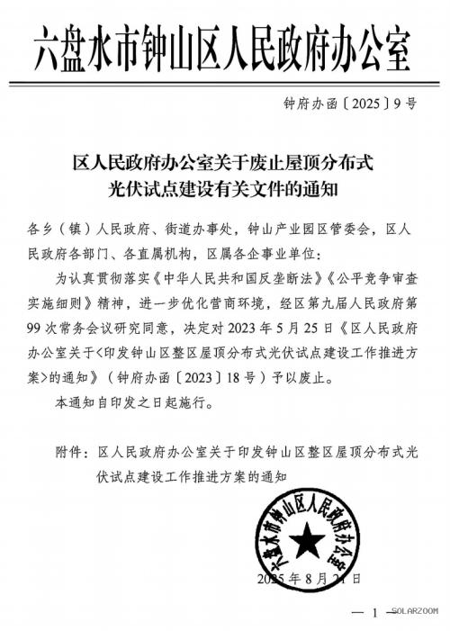 8月21日,贵州省六盘水市钟山区政府办公厅发布《关于废止屋顶分布式光伏试点建设有关文件的通知》。