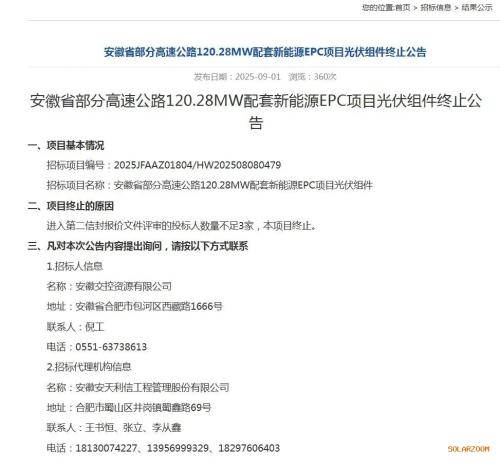 记者获悉,9月1日,安徽省部分高速公路120.28MW配套新能源EPC项目光伏组件终止公告发布。公告显示,项目终止的原因为进入第二信封报价文件评审的投标人数量不足3家,本项目终止。