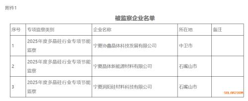 列入《工业和信息化部办公厅关于印发2025年度多晶硅行业专项节能监察任务清单的通知》(工信厅节函〔2025〕318号)的3家企业,名单详见附件1。