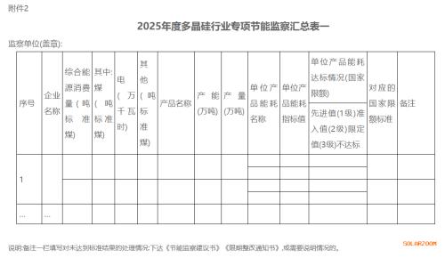 (三)结果上报阶段(2025年9月26日至9月30日)。9月28日前,自治区工业节能中心将多晶硅专项节能监察情况报自治区工业和信息化厅,监察情况包括:多晶硅专项节能监察总结、多晶硅专项节能监察汇总表(1-3)(附件2)。