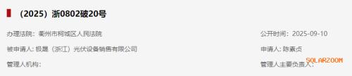 据全国企业破产重整案件信息网9月10日披露,极晟(浙江)光伏设备销售有限公司被申请破产。