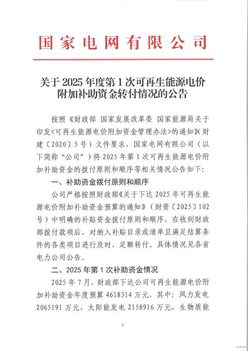 9月15日国家电网发布2025年度第1次可再生能源电价附加补助资金转付情况的公告,公告显示,2025年7月财政部下发可再生能源补贴资金4618314万元。其中风力发电2065191万元,太阳能发电2158916万元,生物质能发电394207万元。