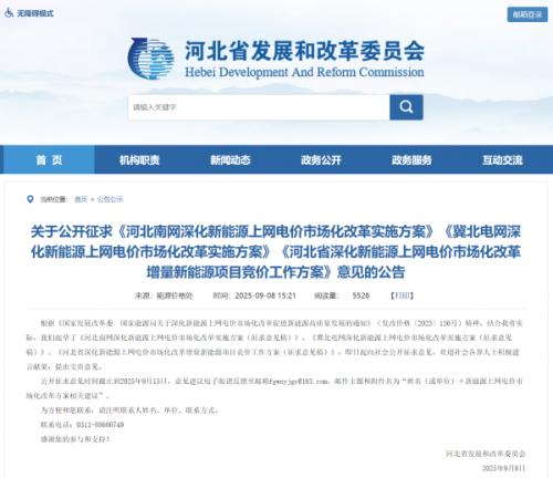 据全球液流电池网获悉,9月8日,河北省发改委发布关于公开征求《河北南网深化新能源上网电价市场化改革实施方案》《冀北电网深化新能源上网电价市场化改革实施方案》《河北省深化新能源上网电价市场化改革增量新能源项目竞价工作方案》意见的公告。