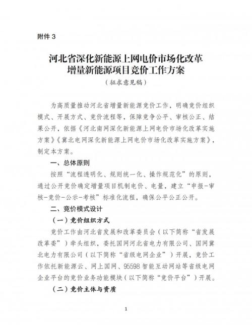 关于公开征求《河北南网深化新能源上网电价市场化改革实施方案》《冀北电网深化新能源上网电价市场化改革实施方案》《河北省深化新能源上网电价市场化改革增量新能源项目竞价工作方案》意见的公告