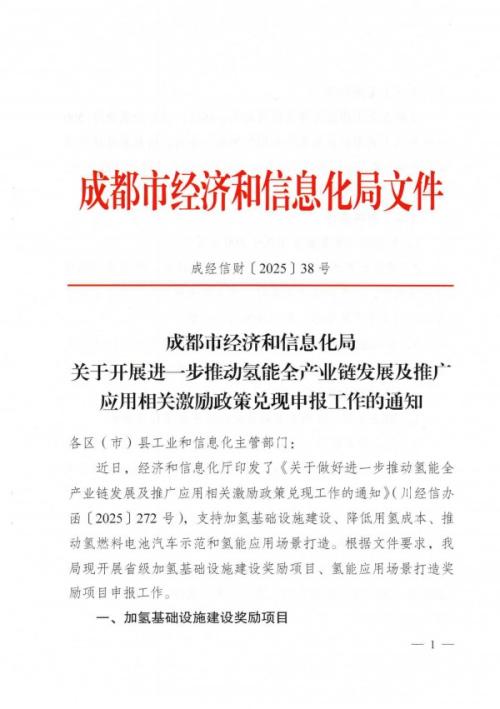 9月17日,成都市经济和信息化局印发《关于做好进一步推动氢能全产业链发展及推广应用相关激励政策兑现工作的通知》,支持加氢基础设施建设、降低用氢成本、推动氢燃料电池汽车示范和氢能应用场景打造。