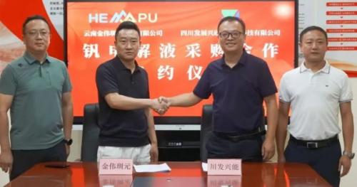 据全球液流电池网获悉,近日,四川发展兴欣钒能源科技有限公司(以下简称“川发兴能”)党支部书记、董事长张杨与云南金伟圳元储能有限公司(以下简称“金伟圳元”)董事长沙索杰,分别代表双方就云南禄丰项目9000立方米钒电解液销售协议完成签约。此次签约标志着两家企业在新能源全钒液流电池储能领域的深度协同合作迈入实质性阶段,为全钒液流电池储能技术的广泛应用与持续发展注入了强劲动力。