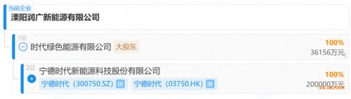 9月18日,江苏溧阳市人民政府发布建设项目环境影响评价文件批复的公示信息,润广别桥镇道成渔光互补光伏发电、润广别桥镇镇东渔光互补光伏发电两大光伏项目公示,建设单位均为为溧阳润广新能源有限公司。该公司为宁德时代全资子公司,股权结构如下图所示