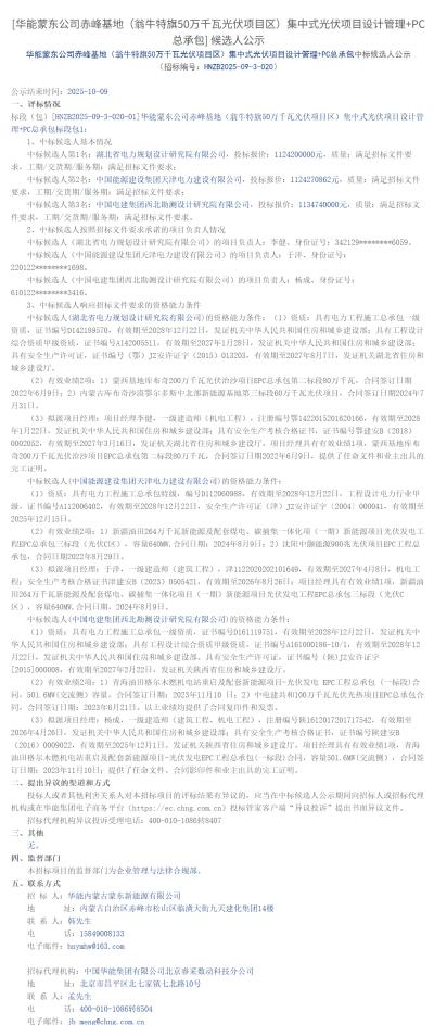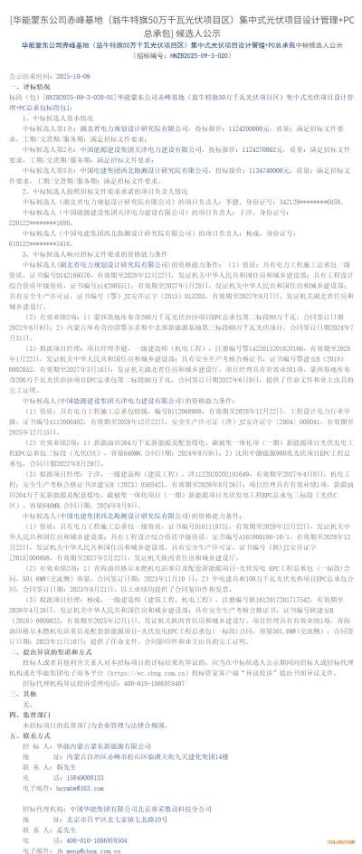 日前,华能蒙东公司赤峰基地(翁牛特旗50万千瓦光伏项目区)集中式光伏项目设计管理+PC总承包中标候选人公示。