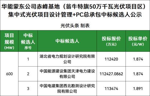 湖北省电力规划设计研究院有限公司、中国能源建设集团天津电力建设有限公司、中国电建集团西北勘测设计研究院有限公司3家企业入围,投标单价1.874~1.891元/W。