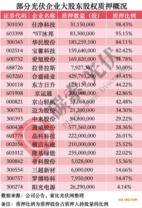 从质押用途来看,共有21起股权质押用于生产经营或者补充企业的流动资金,10起用于融资,其所涉及的企业大多为经营业绩显著承压的主产业链企业,比如合盛硅业、京运通等。而用于个人资金需求的16起股权质押中,像阳光电源、帝科股份这样的“绩优股”居多,但亦有像华民股份、仕净科技等陷入亏损泥潭的“追光者”。
