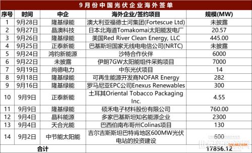晶澳科技9月27日向日本北海道Tomakomai太阳能发电厂供应20.57MW组件;正泰新能9月25日与巴基斯坦国家无线电电信公司、9月9日与土耳其Oriental Tobacco Packaging Inc.达成合作;尚德电力9月19日拿下14MW中东光伏项目;天合光能9月4日签约巴西伯南布哥州Colinas项目(130MW);中节能太阳能9月2日启动吉尔吉斯斯坦巴特肯地区600MW光伏电站的投资建设。