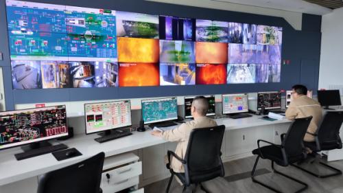 来到垃圾吊操作室,透过观察玻璃,只见巨型垃圾吊如同“钢铁手臂”般灵活伸缩,精准抓取仓内生活垃圾,稳稳输送至焚烧炉进料口。与之相连的2条400吨级焚烧线,在中控系统的智能调控下平稳运行,炉内跳动的火焰将废弃物持续转化为驱动能源生产的热能。中控室内,巨大的电子屏格外醒目,屏幕上各项环保数据实时跳动、清晰可查,从烟气净化指标到污染物排放数值,每一项数据都直观展现着项目的环保硬实力,也让“洁净处理”的承诺变得可见可感。