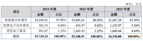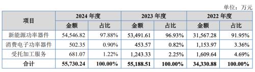 随着光伏组件保护功率器件的销售放量,钜芯科技进入高速增长期,2022年、2023年、2024年新能源功率器件业务分别实现营业收入3.16亿元、5.35亿元、5.45亿元;新能源功率器件产品销售收入占主营业务收入的比例也逐年攀升,分别为91.95%、96.93%和97.88%。
