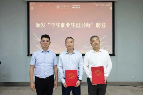 ▲上海交通大学电气工程学院常务副院长刘亚东向电管家集团董事长、总经理邵忠和电管家集团总工程师陆玮颁发“学生职业生涯导师”聘书。
