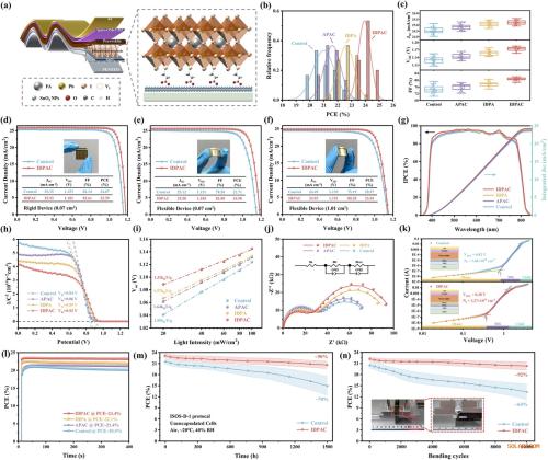 研究成果以“揭示双功能分子诱导的顺序结晶过程中DMSO的充分挥发以实现高效稳固的柔性钙钛矿太阳能电池”(Revealing Bifunctional Molecules Induced Adequate DMSO Extraction in Sequential Crystallization toward Efficient and Robust Flexible Perovskite Solar Cells)为题,于10月16日发表于《先进功能材料》(Advanced Functional Materials)。
