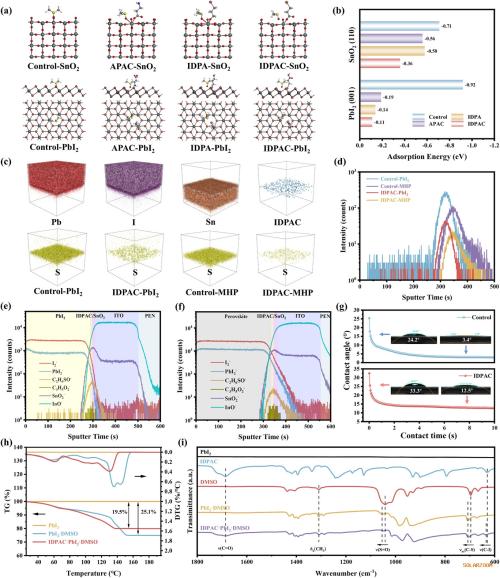 理论计算结果显示双官能团分子显著降低了DMSO分子在SnO2和PbI2表面的结合能,有助于DMSO的充分挥发。飞行时间二次离子质谱确定了DMSO在PbI2与钙钛矿薄膜中的空间分布,并论证了DMSO残留量的显著降低。动态接触角,热重分析及红外光谱等综合分析表明IDPAC分子能够通过化学钝化削弱SnO2与PbI2对DMSO的吸附作用,从而获得埋底界面孔洞消除、残余应力应变松弛的高质量柔性钙钛矿薄膜。