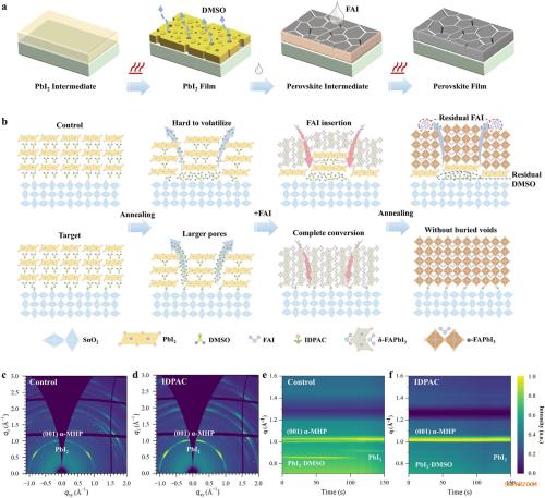 在顺序沉积法制备钙钛矿薄膜过程中,部分DMSO以配体形式嵌入PbI2晶格形成PbI2*DMSO络合物,而剩余DMSO挥发后造成多孔形貌。埋底界面的DMSO作为路易斯碱,被SnO2上的氧空位和PbI2中不饱和的Pb2+双重吸附,抑制了退火过程中的DMSO挥发,从而形成较致密的PbI2薄膜。浸渍FAI溶液后,FAI通过与PbI2*DMSO中的DMSO分子间交换生成δ-FAPbI3.但受限于孔径和表面张力,FAI渗透不完全,导致埋底界面残留PbI2.表面FAI富集,且吸附的DMSO难以去除。高温退火时,晶粒生长与晶界闭合进一步阻碍DMSO逸出,形成界面空洞。引入IDPAC修饰后,羧基与碘代基官能团分别钝化氧空位与配位不足Pb2+,削弱DMSO吸附并促进其充分挥发,形成疏松结构以利于FAI渗透和钙钛矿完全转化。原位掠入射广角X射线散射(GIWAXS)证明了退火过程DMSO的快速充分去除和钙钛矿结晶取向优化。