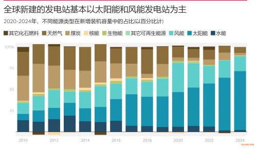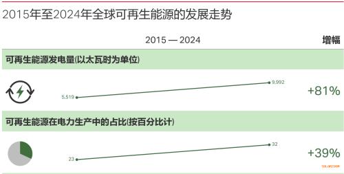 大力投资的结果是,可再生能源在全球电力生产中的占比从2015年的23%上升至2024年的32%。如今,世界范围内超过60个国家一半以上的电力来自于可再生能源。国际能源署预测,截至2030年,可再生能源在全球电力结构中的占比将达到46%。