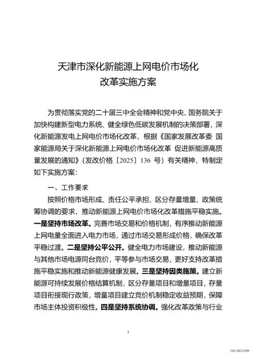 为贯彻党的二十届三中全会精神和党中央、国务院关于加快构建新型电力系统、健全绿色低碳发展机制的决策部署,落实电力市场化改革有关要求,国家发展改革委、国家能源局印发《关于深化新能源上网电价市场化改革促进新能源高质量发展的通知》(发改价格〔2025〕136号),实施新能源发电上网电价市场化改革。为落实国家有关要求,推动改革措施在我市平稳落地,有序实现新能源项目全面入市,我们制定了《天津市深化新能源上网电价市场化改革实施方案》。