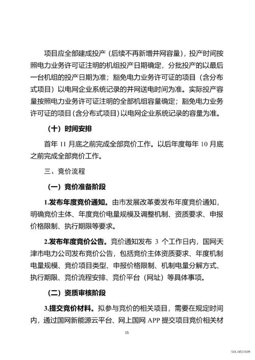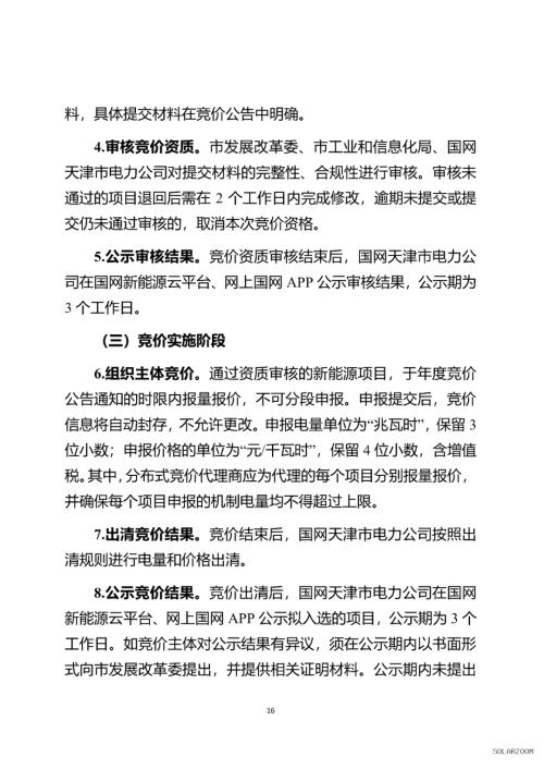 我委每年将发布竞价通知,明确竞价主体、年度竞价电量规模及调整机制、申报价格限制、执行期限等事项,并在我委政务网站公布。国网天津市电力公司按照竞价通知要求,尽快发布竞价公告,明确竞价工作流程、时间安排、竞价平台(网址)等具体事项以及项目审查要点、各类主体操作手册、发电企业授权委托书等附件内容。拟参与竞价的增量新能源项目,在规定时间内通过国网新能源云平台(集中式新能源项目)、网上国网APP(分布式新能源项目)提交竞价材料,市发展改革委、市工业和信息化局及国网天津市电力公司组成的竞价工作小组将对提交材料的完整性、合规性进行审核并公示。通过资质审核的新能源项目可进行报量报价,竞价信息申报提交后将自动封存,不允许更改,确保竞价工作的公平公正。