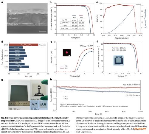 实现高效稳定全热蒸发器件制备的全热蒸发反型钙钛矿太阳能电池效率达25.19%,为目前该类型器件最高水平,且具备优异的运行稳定性与大面积均匀性,展现出良好的产业化前景。
