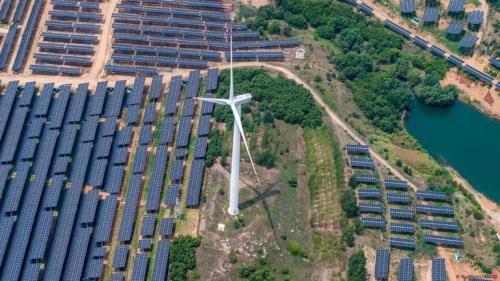 中国电力企业联合会发布数据显示:2024年,全国新增发电装机容量4.3亿千瓦,再创历史新高。其中,风电和太阳能发电合计新增装机3.6亿千瓦,占新增发电装机总容量的比重超过八成。图为青岛附近的一处光电、风电场©NurPhoto/IMAGO