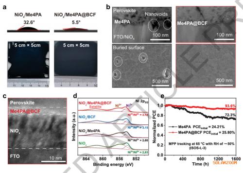 实现埋底界面质量与稳定性的双重提升:该HTL结构不仅改善钙钛矿薄膜的结晶质量,减少界面缺陷,还显著抑制NiOₓ与钙钛矿之间的有害反应,提升热稳定与光稳定性。