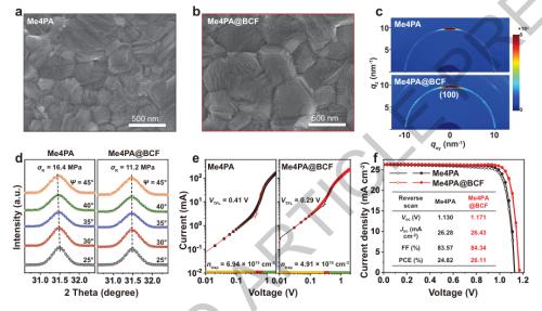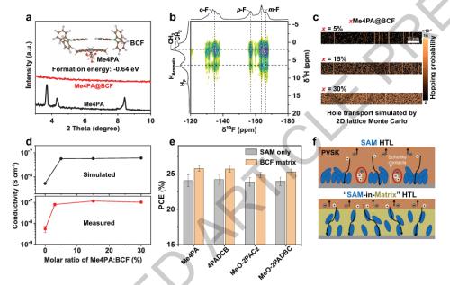 提出“SAM-in-matrix”新型空穴传输层结构:将自组装分子(SAM)嵌入稳定的BCF基质中,有效抑制SAM分子聚集,形成均匀、高效的电荷传输通道,提升器件性能与重复性。