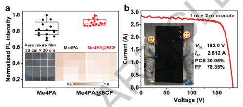 最终,成功制备出1米×2米的大面积钙钛矿太阳能组件,其认证效率达到创纪录的20.05%。