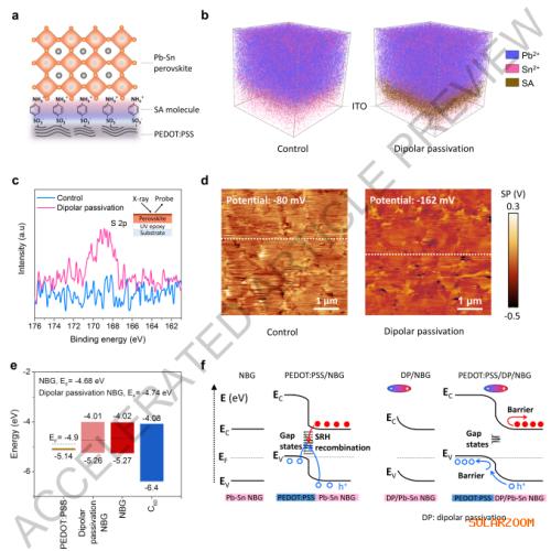 在此,作者开发了一种偶极钝化策略,该策略在降低混合铅锡钙钛矿埋底界面陷阱密度的同时,还能实现HTL/钙钛矿界面的精确能级对齐。这种偶极诱导的钝化增强了欧姆接触,促进了空穴向HTL的高效注入,并排斥电子远离HTL/铅锡钙钛矿界面。
