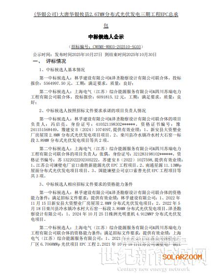 2025年10月27日,【(华银公司)大唐华银攸县2.67MW分布式光伏发电三期工程EPC总承包】中标候选人公示。